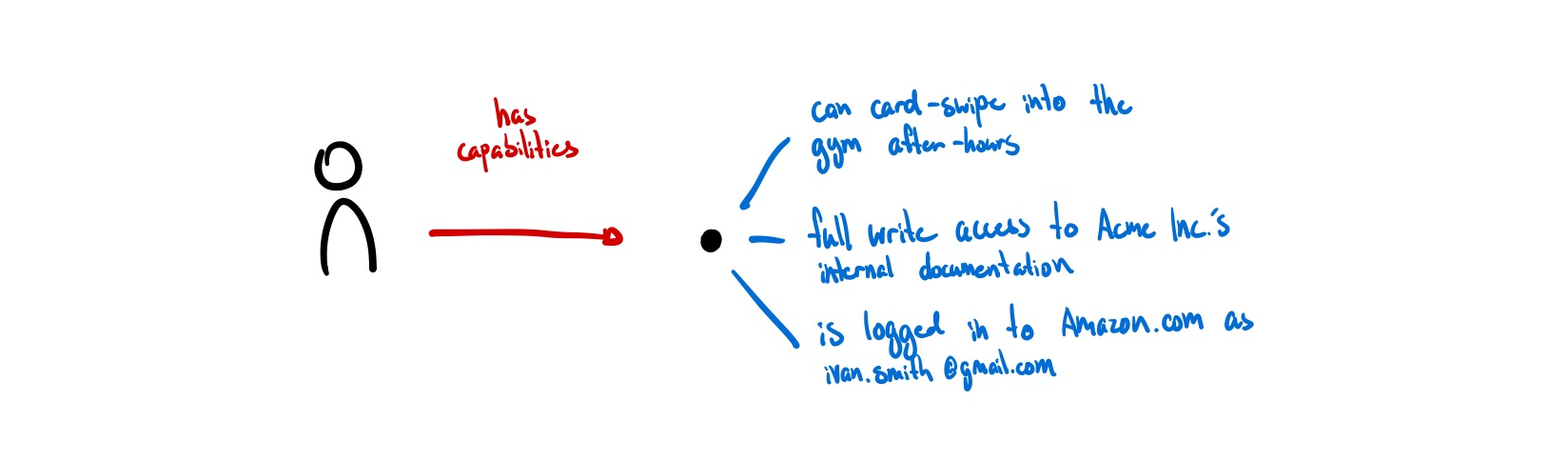 When I think about what digital identity ultimately feels useful for, it is to gesture at capabilities rather than attributes. My identity can also be represented by how I act and what I have permission to do. Gordon Brander suggests similarly: “digital identity should not be about who you are, but what you are authorized to do.” 5