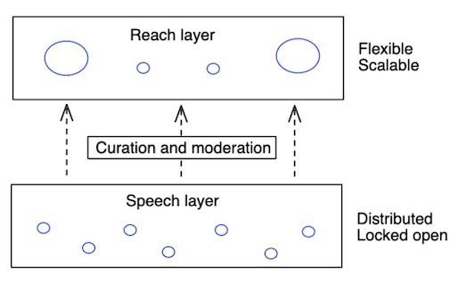 Our model is that speech (data, networking) and reach (crawling, aggregation, algorithm) should be two separate layers, built to work with each other. The “speech” layer should remain neutral, distributing authority and designed to ensure everyone has a voice. The “reach” layer lives on top, built for flexibility and designed to scale.