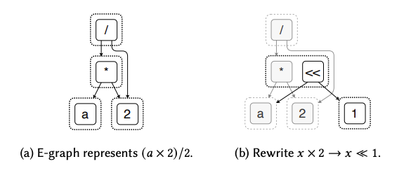 Instead of destructive rewrites over the tree of nodes, we can grow the e-graph by representing the transformed program as new equivalences. The following is an example of rewriting to be .