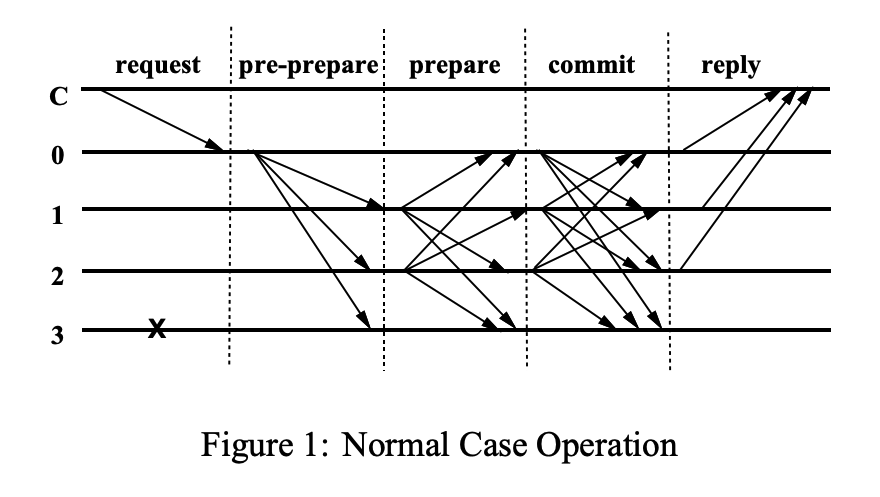 1. Pre-prepare: mainly used to ensure request was assigned sequence number in view . Primary assigns a sequence number to the request and multicasts a pre-prepare message with digest :