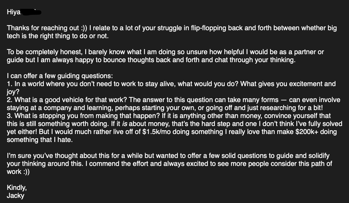 - Like yeah, I know this probably isn’t the best way to go about it. Maybe they’ll tell me what I’m working on is a long solved problem and I’m wasting my time. Or “couldn’t you just use x and y to achieve the same effect”? I can’t help but sometimes feel like I’m wasting my time — there are so many smart people working on the same problem, what makes me feel like I can be the one to make a meaningful contribution to it?