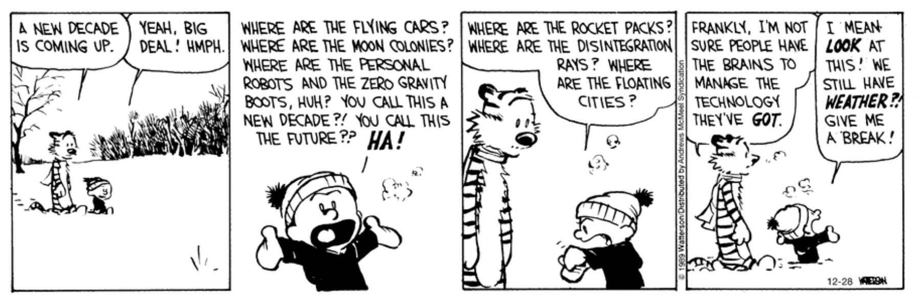 The question “Where is my flying car?,” Wikipedia tells us, “is emblematic of the supposed failure of modern technology to match futuristic visions that were promoted in earlier decades”. Flying cars have become a symbol of mismatch: the future as imagined in the first half the 20th century seemed a lot brighter than the present we’re living in now.