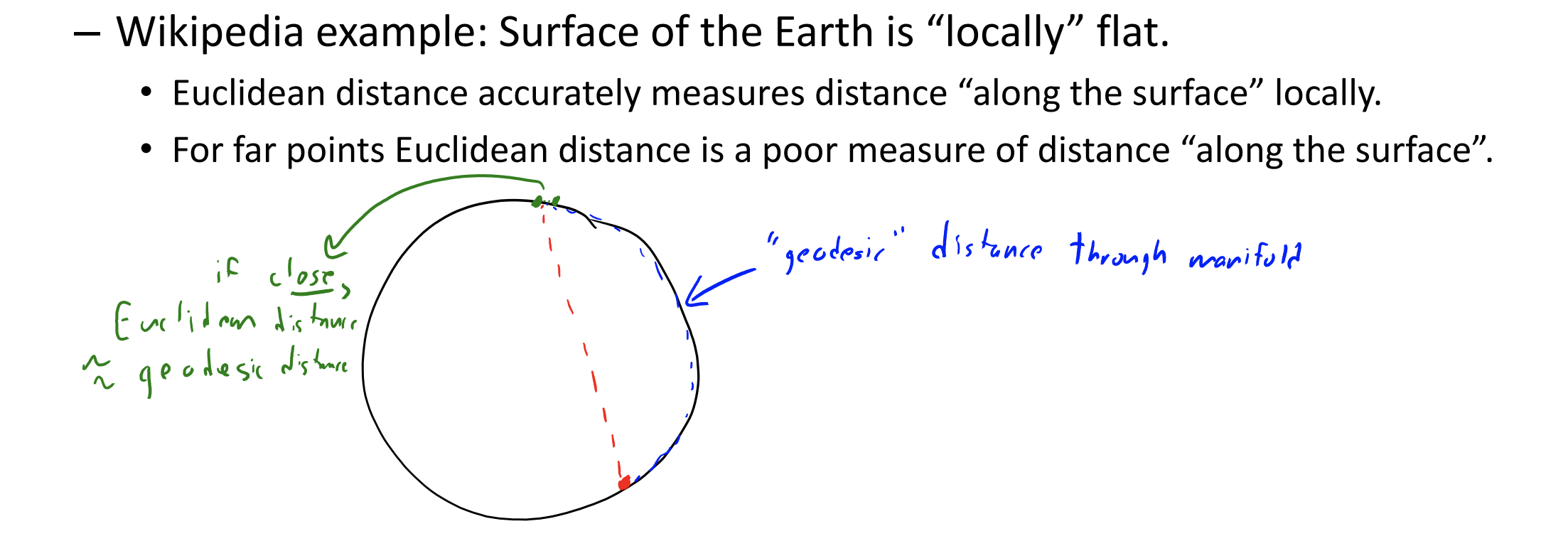 However, using Euclidean (L2-norm) may not be a great representation of data that lives on low-dimensional manifolds. In these cases, Euclidean distances make sense “locally” but Euclidean distances may not make sense “globally”.