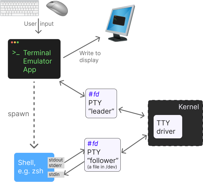 • The terminal emulator then spawns the shell which reads and writes from the follower PTY (the shell’s stdin, stderr, and stdout) is set to the follower PTY